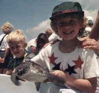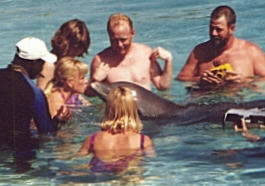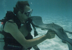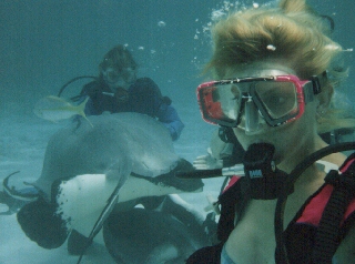 I received my first "C" card after completing the 8 week diving phase of training in Basic Underwater Demolition and SEAL (BUD/S) Training at USNAB Coronado, CA in '79. We spent our first 3 weeks doing "standard" Open-Circuit SCUBA training with twin-72 cu.ft. steel tanks in the pool, in San Diego Bay, and in open ocean. "Standard" training included underwater equipment disorientation drills (our instructors were most helpful at this!), high-surf ocean beach entry and exits, 1 mile underwater compass swims, and "jock-up drills" (pushups with 80 lbs worth of dive gear on our backs) when we screwed up. We tried not to screw up a lot! We spent the next two weeks diving with an old WWII closed-circuit oxygen rebreather rig called an Emerson. It had a pair of vest-mounted rubberized canvas "breathing bags", and a fiberglass backpack which contained a small oxygen (O2) cylinder and a carbon dioxide (CO2) scrubber canister. A needle valve could be adjusted to meter O2 appropriately for your breathing rate, and a "dump" valve was used to add large volumes of O2 to maintain your breathing volume any time you descended. You could swim underwater at shallow depths with this for over 6 hours, without giving off any bubbles! While diving the Emerson, we got to perfect our night underwater compass swims and swimmer-ship sneak attacks. The Emerson did have a few disadvantages. First, because 100% O2 becomes toxic to the human body at pressures much above 1 atmosphere, we were limited to shallow depths, and could only briefly dive deeper in case of emergencies. Second, the Emersons were old, and sometimes developed leaks. When water got into the rebreather loop it mixed with the chemical granules in the CO2 scrubber canister and made a "caustic cocktail", which you inhaled on your next breath. Imagine trying to gargle a mouthfull of seawater and Drain-O at 20 feet without any "air". Our last 3 weeks of dive phase training was spent with the Mark 15, a $25,000 fully-computerized state-of-the-art rebreather. It had an O2 bottle, a diluent gas bottle, the CO2 scrubber cannister, and a flexible diaphragm breathing expansion chamber with 3 O2 sensors and a computer all fully contained in a fiberglass backpack. The 3 O2 sensors monitored the partial pressure of O2 in your breathing mixture, and the computer would continually maintain 0.3 atmospheres partial pressure of O2 in your breathing gas mixture, which allowed you to dive at any depth without succumbing to oxygen toxicity. As you dove deeper, the rebreather diaphragm activated a valve that added diluent gas to maintain the volume of your breathing mixture. The diluent gas could be either nitrogen (N2) or helium (He), depending on the depth requirements for the dive. Because the Mark 15 always maintaned your partial pressure of O2 at 0.3 atmospheres at any depth, the remainder of your breathing mixture was the diluent gas. When using N2 for the diluent, your risk of nitrogen narcosis or getting the bends was greater using the Mark 15 than it would be using conventional open circuit SCUBA. For example, I remember doing one open ocean (there wasn't a bottom) 120 foot "bounce dive" for training with the Mark 15. At 120 feet I was breathing a mixture of 0.3 atmospheres O2 and 4.7 atmospheres N2 (only 6% O2 and 94% N2!) For nitrogen saturation, this was like diving open circuit SCUBA at 150 feet. I remember definitely being "Narc'd", and then having to do a couple of significant decompression stops. After all this, they gave me a NAUI Open Water I "C" card. I don't know, is PADI certification any easier? Here are a couple of pictures of Barb and Kristin from our second dive trip, to Grand Cayman Island. Here's one of me at Stingray City Sandbar feeding the stingrays. The rays are really very tame. They have incredibly soft silky-smooth underbellys, and are a lot of fun to pet. We fed them by holding small pieces of squid in our fist, which the rays quickly "sniffed" out. They can generate a pretty good vacuum with their mouths and can suck the food right out of your hand. They are a lot like an underwater Hoover! Barb and I took our third trip together in March '97 to Bonaire (part of the Dutch West Indies located 50 miles north of the coast of Venezuela) this past March. We went with a really fun group of people from The SCUBA Diving Company, stayed at Captain Don's Dive Habitat, and had a terrific time the whole time we were there. We saw lots of colorful sponges, LOTS of fish, several 6' to 8' green moray eels, and dove a wreck called the Hilma Hooker. I'll try to get some pictures scanned in some time soon! Our most recent dive trip was to Roatan, a small island north of the coast of Honduras, in January '98. We stayed at Anthony's Key Resort, on a smaller island (key) next to Roatan. AKR was a wonderful place to stay, with a very relaxing atmosphere. Right next to AKR is the Roatan Institute of Marine Science, which has a terrific dolphin and marine science program. Here is a picture of Barb playing in the dolphin pen. Rodale's Scuba Diving Magazine. Last Updated: November 15, 1998