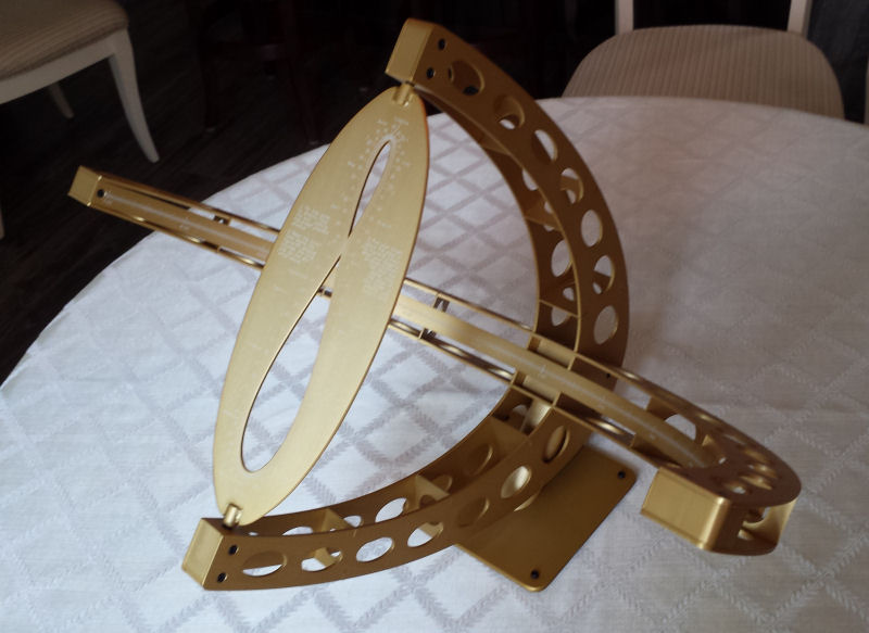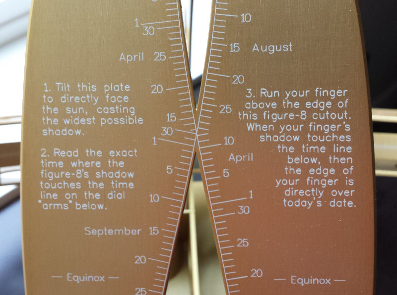 ![]() The months and days of the year are laser-etched around the perimeter of the figure-8 cutout. By running your finger above the inside edge of the cutout you can determine the exact date... when the edge of the shadow from your finger falls on the time line on the equatorial dial below, then the edge of your finger is directly over the current date on the gnomon.